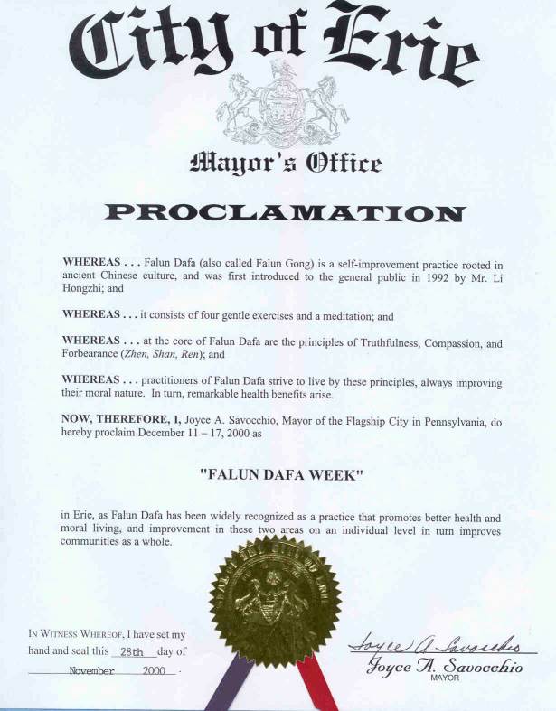 【明慧网2000年12月20日】 宾夕法尼亚州伊利县宣布2000年12月11日至17日为“法轮大法周 ”。
