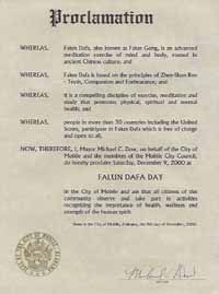 阿拉巴马州莫贝尔市宣布2000年12月9日为法轮大法日