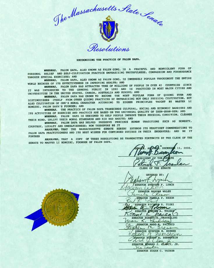 决议,马萨诸塞州参议院在此表达对法轮大法修炼者真诚的嘉奖并衷心的祝愿他们的努力取得成功;并且;