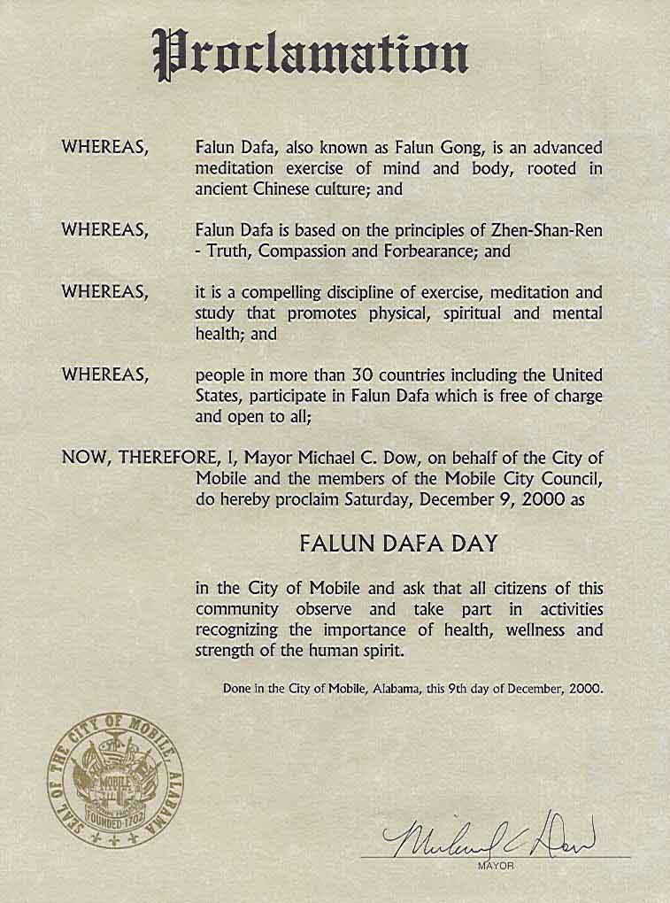 阿拉巴马州莫贝尔市宣布2000年12月9日为法轮大法日