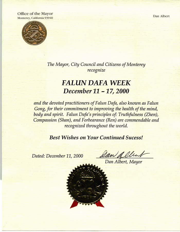 【明慧网2000年12月25日】 加利福尼亚州蒙特利尔市对法轮大法周的认证书