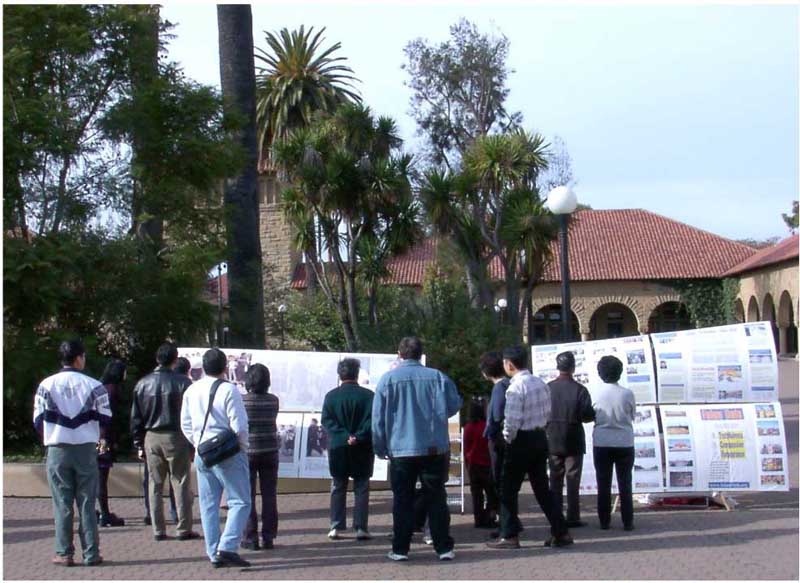 【明慧网2000年12月28日】圣诞节这一天,斯坦福大学主广场上,来来往往的人群川流不息。他们中大多是来观光旅游的,其中不乏大陆来的游客。当人们在这所世界著名学府的校园漫步时,意外地发现了十几幅醒目的法轮功图片介绍,不禁驻足。有的游人主动拿取图板旁边资料架上的报纸或散页。一天下来,在图板前留步的人不下七百人。