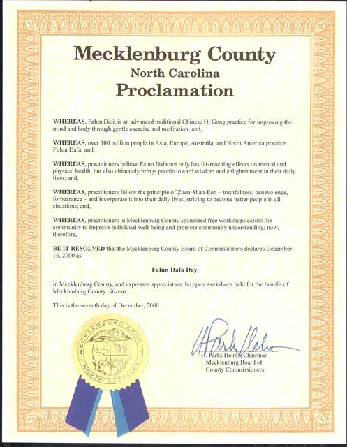 【明慧网2000年12月28日】 北卡罗来那州麦可轮伯歌郡宣布2000年12月16日为“法轮大法日”。