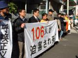 去年今日,北京法庭“审判”原法轮功研究总会负责人李昌、王志文、纪烈武,并最重判刑达18年。今年的同一天日本东京大法弟子20多人来到中国使馆前请愿,举着大幅“江泽民停止镇压法轮功”“106人被迫害致死”“遭受无名苦难,呼唤正义良知”等条幅,同时分发中日英文大法报纸,向世人讲清真相。