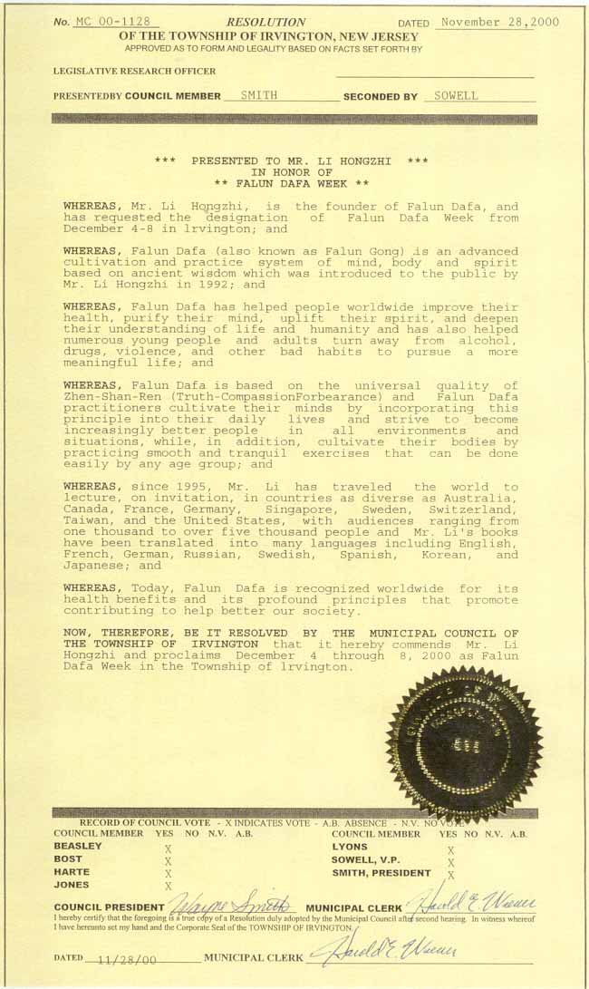 在颁发决议证书的仪式上,市议长史密斯先生发表了热情洋溢地讲话,他首先赞扬了李老师将法轮大法带给世界人民的丰功伟绩。接着他又说,希望通过这个决议能把法轮大法介绍到峨文顿市来,让这里的市民也能受益。