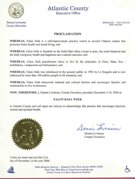 【明慧网2000年12月5日】新泽西州亚特兰大镇宣布2000年12月4日至10日为“法轮大法周”。