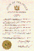 特拉华州(State of Delaware):州长汤姆斯.卡坡尔(Thomas R. Carper), 副州长罗斯曼奈(Ruth Ann Minner)签署的对法轮大法的褒奖令,并宣布2000年12月4日至10日为特拉华州法轮大法周。