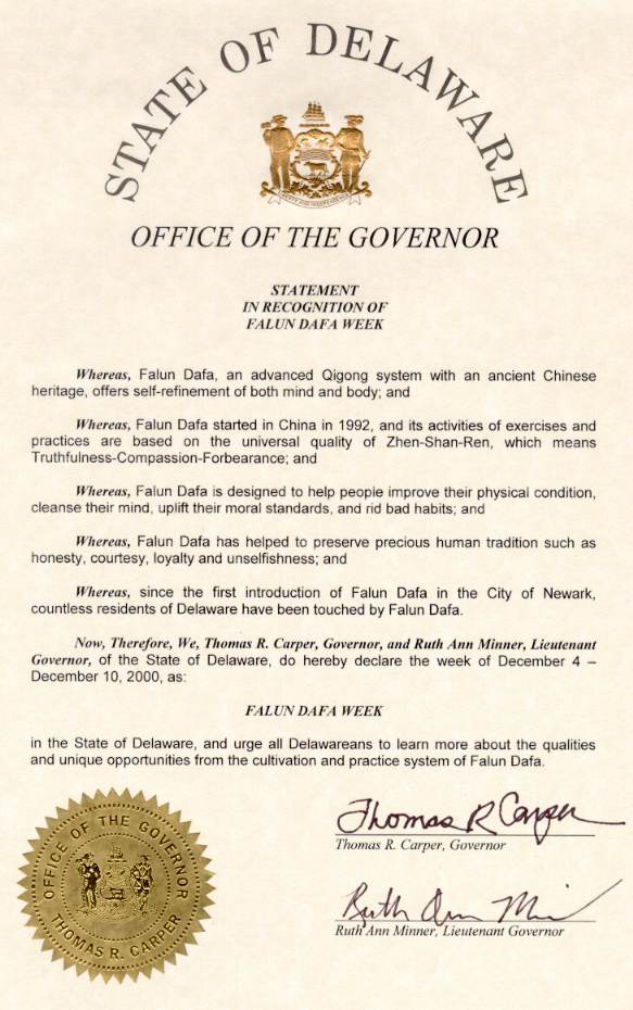 【明慧网2000年12月6日】 特拉华州(State of Delaware):州长汤姆斯.卡坡尔(Thomas R. Carper), 副州长罗斯曼奈(Ruth Ann Minner)签署的对法轮大法的褒奖令,并宣布2000年12月4日至10日为特拉华州法轮大法周。