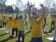 悠扬的大法音乐、学员们舒缓的动作以及摆在炼功场地的十多副大型的有关法轮功真相的宣传画吸引了众多的居民驻足。当场就有二十多位当地居民开始学炼动作。其中一半以上参加了当晚举办的观看李老师讲法录像的洪法班,还包括几位西方学员。