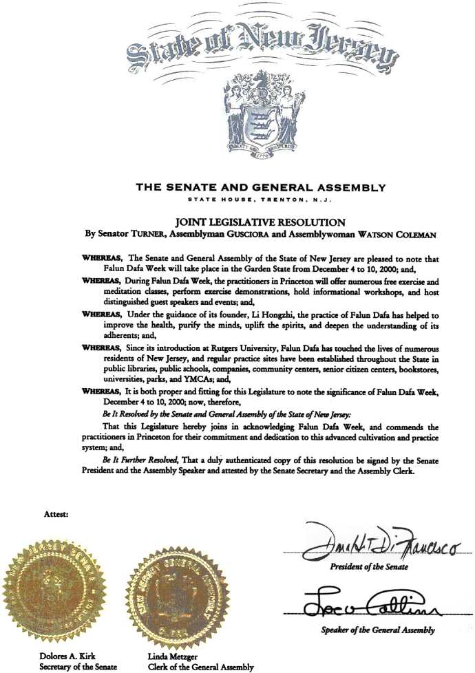 鉴于,自从传入罗格斯大学以来,法轮大法触及了新泽西州的无数居民,在全州众多的图书馆,学校,公司,社区中心,老年中心,书店,大学,公园,YMCA等处都设有固定的炼功点,并且;