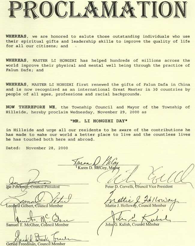 【明慧网2000年12月7日】 新泽西州希尔赛德市市长Karen McCoy女士和七名市议员联合宣布2000年11月29日为希尔赛德市“李洪志先生日”,并号召全体希尔赛德市人民关注李洪志大师为使世界更加美好而做出的贡献。Karen McCoy女士和七名市议员还赞扬了李洪志大师是被30多个国家的不同年龄,职业和种族背景的人们所公认的国际大师,帮助了全世界上亿的人民改善了身心健康。