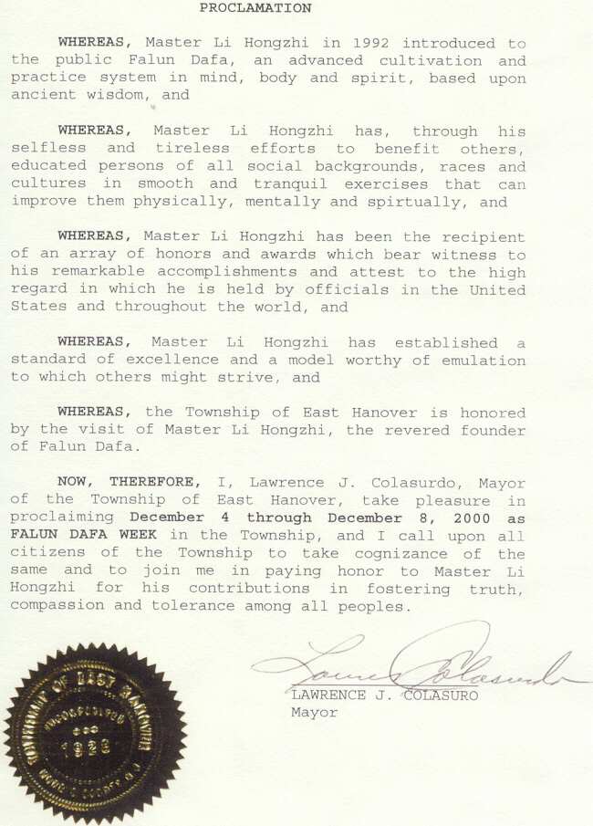 “众多的荣誉和奖励证明了李洪志大师所取得的非凡成绩,也表明了他在无数的美国政府官员和国际社会代表中享有崇高的威望。”
