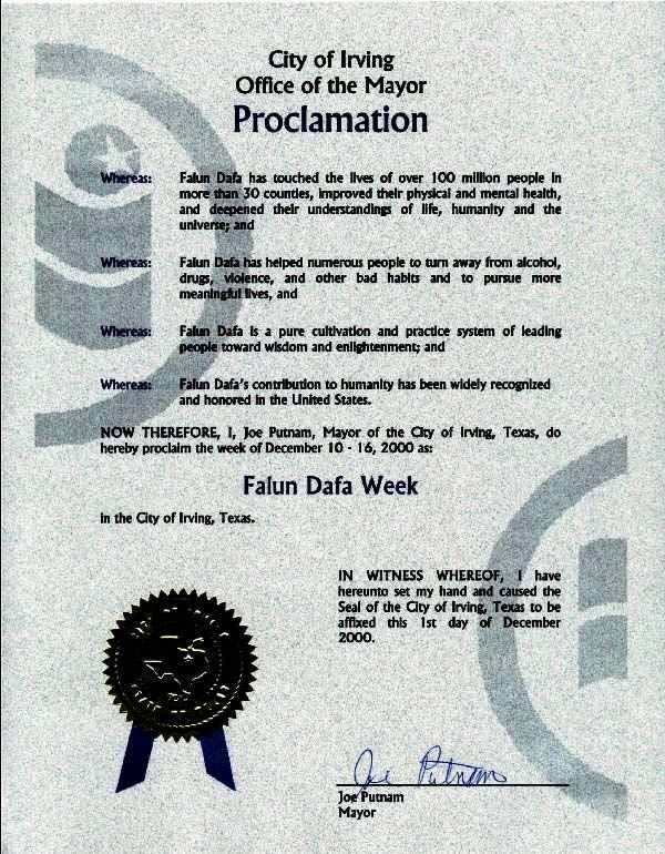 做为见证,我现在举起我的手将德克萨斯州欧文市的印章于2000年12月1日加盖于这份公告上。
