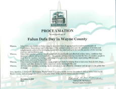 为此,我,爱德华H.麦克纳马拉,韦恩郡首席执行官,郑重宣布2000年12月9号为韦恩郡法轮大法日,并鼓励本郡民众知晓这一古老中国修炼系统。