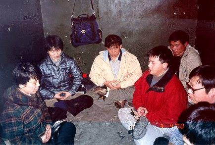 被北京公安拘留的法轮功学员在拘留中仍然坚持练功。图中穿红色夹克者就是湾区法轮功学员曾盛,其他人姓名不详。(照片由徐震拍摄)