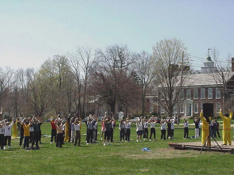 【明慧网2000年4月11日】很多美国学员在自己住家附近参加了4月8日“世界气功和太极日”活动,演示并教授法轮功功法,受到欢迎。下图是麻省Framingham40多名学员向群众教功的场景。