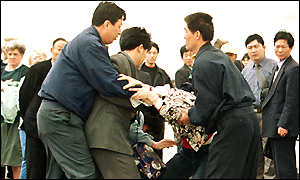 由于广场上几乎充满了便衣,他们特别注意拍照的人,照相几乎不可能。一位法轮功学员看到5、6个西方人在警察抓人时拍照,被警察抢走照相机并把西方人也带走。在被抓的弟子中有拿着横幅的,但还没等打开就被便衣带走了。