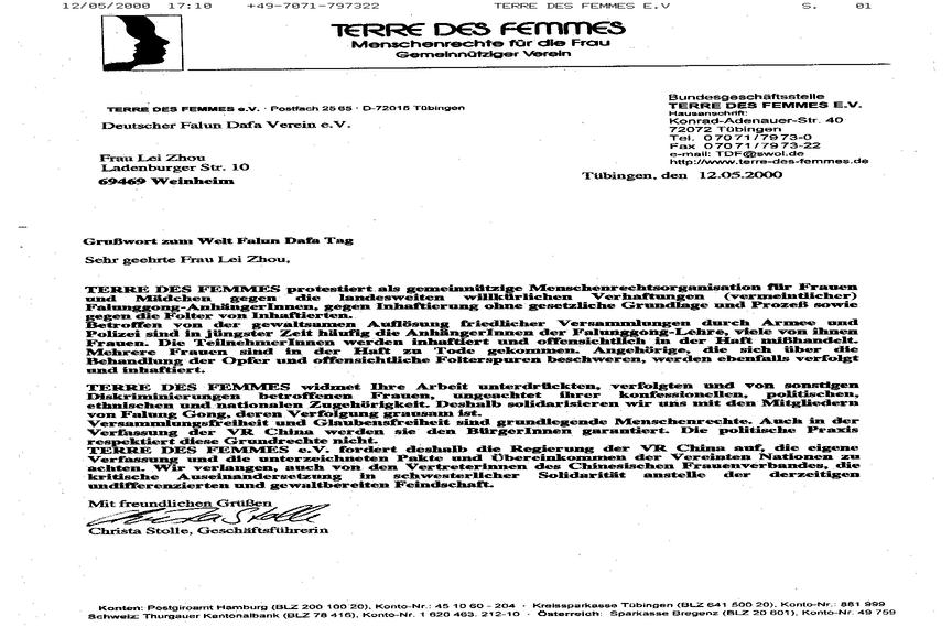 “妇女人权”是一个致力于保护妇女及女童人权的公益性组织。在此我们强烈抗议在全中国范围内对法轮功学员,由其是对女学员的肆意逮捕;抗议那些在没有法律依据的情况下,对法轮功学员进行的审判;拘留甚至酷刑虐待。