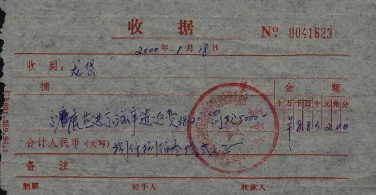 四川省社会科学院历史研究所龙岱先生(不炼功),因妻子鹿燕(修炼法轮功)到京上访而被强行索取所谓“遣返费”3832元及无理罚款5000元的收据。