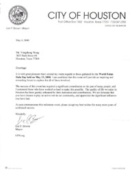 休斯顿市市长李.布朗致“世界法轮大法日”的祝贺(附图片)