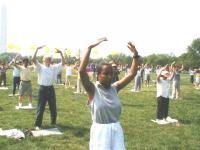 10点半左右,庆祝活动正式开始,首先由学员宣读了世界法轮大法日的祝贺词,随即近70名学员排成整齐的方队开始炼功。其中有年过八旬的老人,有稚气未脱的孩子;有东方人,也有西方人。不论文化,种族的不同,大家都共同融入炼功音乐当中。