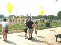 一个小时后,草坪上已充满了喜庆的气氛:三条醒目的大横幅,上面用英文书写着“真、善、忍”、5.13世界法轮大法日和法轮大法;学员们精心制作的宣传板吸引过往的游人。金黄色的气球在风中漂荡。