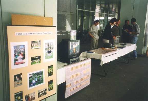 这一天在六个小时里我们放映了20分钟的李老师教功录像带,播放法轮功音乐,展示了奥地利,德国和中国大法弟子的照片,同时在询问台上陈列了一些书和不同语言的传单。许多人从此路过,而且很多亚洲人对此很感兴趣。我们不得不承认我们在那里从来没见过这么多亚洲人。