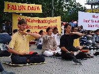 【明慧网2000年7月24日】 一年前的今天,中国政府开始了对法轮功全面地邪恶镇压,致使29位大法弟子的生命被残酷剥夺,成千上万的学员仍处在被肆无忌惮的迫害之中。为了制止这罪恶的行径,为了向世人讲明真象,为了向中国政府再次提出正义的要求,7月21日上午10点到13点来自德国各地的八十多位大法弟子,聚集在柏林的中国大使馆街对面。学员们打出一幅幅印有“真、善、忍”, “法轮大法”中德文标语的横幅,“修真善忍何罪,还法轮功清白”,“立即停止迫害法轮功学员”字样,十分醒目。学员们手拿着被迫害致死的学员陈子秀、陈瑛的大幅生平照片,悼念所有在中国被迫害致死的大法弟子。中国警察在天安门广场殴打学员的残酷照片和大法弟子集体炼功祥和场面的照片形成强烈对比,使路人驻足观看。学员们不时向路人散发大法资料,在悠扬的大法音乐的伴随下展示了法轮功第五套功法。
