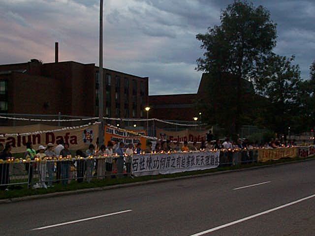"法轮大法"和"真善忍"横幅悬挂在树间,"停止镇压法轮功","还法轮大法自由","释放在押大法弟子"等几张中英文标语和若干大法宣传画一溜排开在人行道一侧。大家随着祥和的音乐静静的打坐。当地中文电台预告了此次活动。几家主要英文电视台,电台,及中英文报纸对请愿活动进行了报道。一家英文电台还做了现场直播。大法弟子对中国目前的情况做了简要说明,并对中国政府的污蔑做了事实澄清。国会议员罗伯-安德斯发表了简短演讲,对大法弟子坚持不懈的精神表示支持。卡尔加里弟子宣读了7.20声明和致中国政府的一封信。当两地大法弟子代表和罗伯-安德斯先生一同向领事馆递交请愿信时,领馆竟不敢开门,大家便将信从门底下塞入。下午五点左右,大家点起白蜡烛,树上扎起黄丝带,纪念在过去一年间为大法献身的几十位同修。期间,两地大法弟子交流了学法心得与弘法经验,并相约两地携手,共同为大法在阿尔伯塔省的弘传齐心努力!