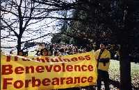 一周年后的今天,上午十点半钟,从纽省,维省和昆士兰省赶来的300多名学员聚集在堪培拉中国大使馆对面的草坪上,开始了一天的和平请愿活动。要求中国政府通过和平对话方式解决对法轮功的邪恶镇压;尊重宪法,尊重人权,停止对法轮功学员的关押逮捕;立即无条件地释放所有被非法监禁,关押的法轮功学员,还法轮功以清白。