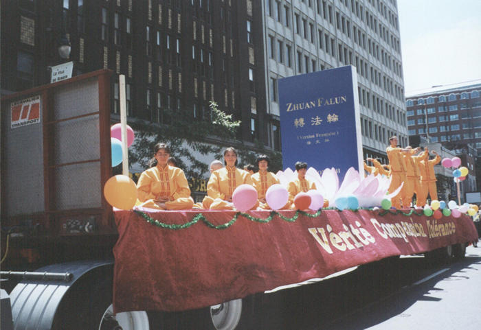 上午十一点,游行活动在10万名观众的期待中正式开始。在色彩鲜艳的英、法文横幅“真、善、忍”、法轮图形和大型“FalunDafa”横幅的引导下,在<<普度>>的音乐声中,缓缓地驶来了学员们精心装饰的大型彩车。绒布的深红色把彩车妆扮得庄重而有生气,两侧金黄色的“真、善、忍”(法文)格外醒目;似乎飘乎于蓝天白云之上的巨型莲花,托起的是2.4米高的<<转法轮>>(法文版)模型;十几位学员舒缓地演炼着五套功法。在彩车之后,行进中的近三十名学员,手执标有“真、善、忍”和“法轮大法”的彩旗及各色气球。场面祥和宁静,气氛感人至深。所到之处受到观众的热情欢呼,很多人竖起拇指向学员致意,许多人不断重复地喊着“Falun Dafa”,一些人追着彩车摄影录像,更多的人则是主动询问大法情况、索要大法资料。由于事前被告知,游行时不得主动派发资料,所以学员携带的资料不多;未料到索取资料者众多,在游行开始不久,所带英法文资料即被散发一空,立即复印也无法弥补即时所需。