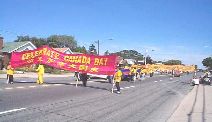 本来气象预报说可能有雨,但我们却遇到了晴天。早上的大游行是在East York区。9时起,120余名法轮功学员穿着鲜艳整齐的服装陆续来到了游行出发地点,开始准备气球、横幅、报纸等弘法材料。由于近来特别多的人对法轮功的真实情况感兴趣,所以我们又赶印了1万多份报纸。