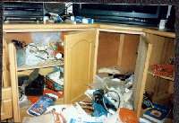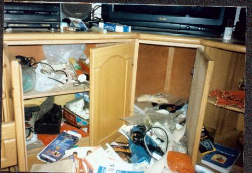 22日上午,我回到家,一看门坏了,屋里翻了个底朝天。当时,周拿着我家钥匙带着两名干警闯进屋里,就开始照相。我找他要钥匙,他说到派出所再给我,照完后便扬长而去。