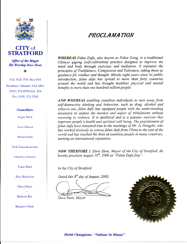 因此现在,我,戴维亨特,斯特福特市市长,现在宣布2000年8月19日为“法轮大法日”。