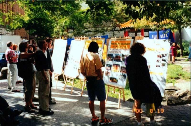 图片展出的翔实的资料和大法真象,从早上九点到下午七点,一直吸引了来往不断的中西人士。学员们不时地给感兴趣的人们送上大法的资料,回答观众提出的各种各样的问题。在大法音乐声中,学员们不断的集体炼功,也引起了人们的极大兴趣,人们或站或坐,感受这祥和的气氛;有的人久久不愿离去,有的人则当场学炼功法。一位女士学了一遍功法之后,立即加入学员之中集体炼功,并说这(法轮大法)就是她生命中所需要的。还有人对学员说:“我感到你们的心是那么平静。”
