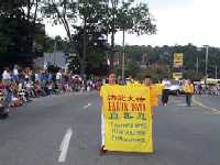 8月7日是市民节日, 哈利法克斯地区将有大型的游行。尽管我们一共只有十来名学员,事先也没有申请加入游行,但是大家一致认为一定要把握住这次宝贵的洪法机缘,让更多的世人知道真相。当天清晨,两个学员提前赶到了游行出发地向组织者提出申请加入,并很快获得了批准。消息传来,我们在家等待的几个人迅速出发赶向集合地点。由于人生地不熟和一些道路的提前封闭,我们迟迟无法赶到出发地点。时间一分一秒地过去,马路旁挤满了人群,至少有10万人,我们甚至看到了开路的马队已经走过来了。最后,在两位热心人的指引下,我们终于赶到了出发地。这时,游行队伍已经出发了一半,我们打开了印有中英文“真善忍”、“法轮大法”和“法轮大法义务教功”的金色横幅,放起“普渡”音乐,井然有序地插入了游行队伍。