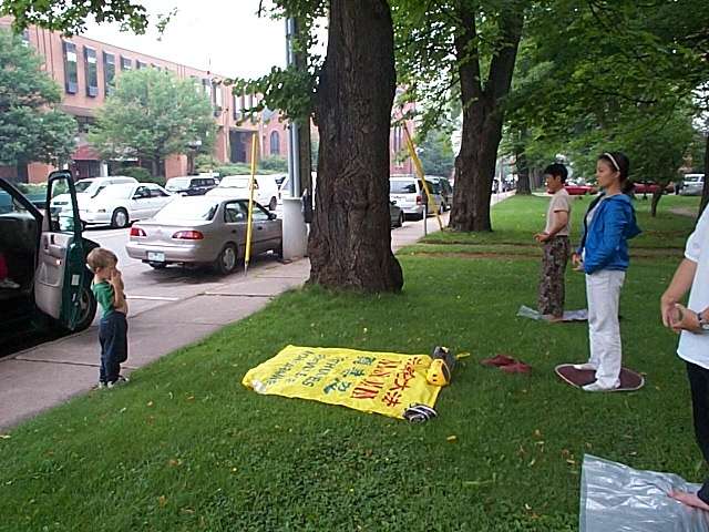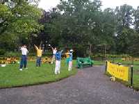 中午前后,我们来到一处热闹的风景点洪法炼功。(见图)来自世界各地的游人在我们面前川流不息,很多人停下来看我们炼功,他们静静地看着我们,我们就把有关法轮功真象的资料送给那些长时间注视我们的人。在不远处有一个街头卖唱者,他在弹奏着刺耳的摇滚乐。当他察觉很多人的目光停留在我们身上时,就很不满意地与管理人员协商让我们退到了一块不很显眼的草地上。然而,这样做只能使好奇的人们更仔细的观察我们。