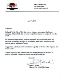 贺信我代表德尔.雷奥市很高兴地认识到法轮大法的适宜教导给全世界人民带来的重大影响。