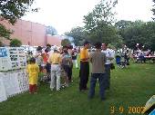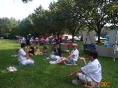 学员们一遍一遍地展示着五套功法,祥和、宁静的场面,和周围的热闹、喧哗形成了鲜明的对比。不时有人在一旁观看,或询问有关大法的详情,或认真地翻阅大法的资料,更有十几个大人、小孩当时就要学五套功法。