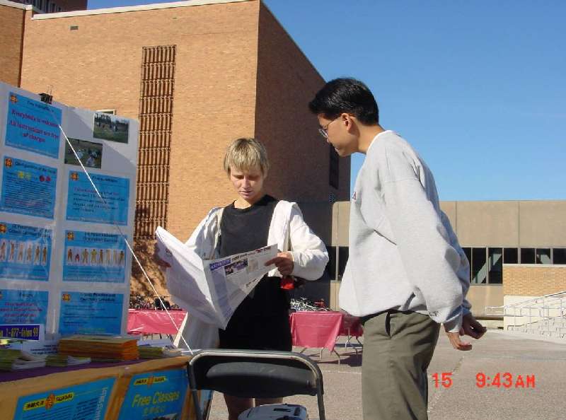 九月中的两天,明州的学员利用大学开学机会向广大美国人民和入学新生洪法。这此活动共进行两天。学员利用这个机会向世人说明修炼法轮大法的益处。