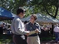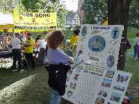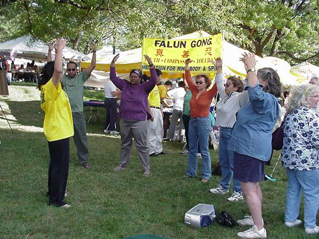 一位美国人前几天打电话说看到法轮功报纸后很愿意进一步了解法轮功。我们告诉他星期六的活动后,他早早地来到我们的展位,并马上学习五套功法。问了很多问题。当听说法轮大法是性命双修的功法后,他非常兴奋,并告诉我们这就是他一直要找的功法。虽然他学其它气功许多年,但没有一个满意的。这位有缘人在我们展位前流连忘返。几次回来与学员交谈。他说如果不是腰有毛病,他马上会加入我们的炼功队伍。带着<<法轮功>>,他满意地走了,还表示一定要来参加我们将在图书馆举办的介绍班。