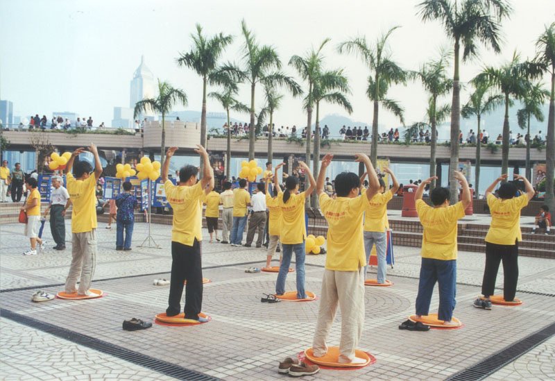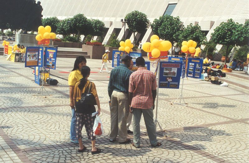 在学员做功法示范时,确实吸引一些途人驻足,但在大法遭受诬蔑和恶毒攻击的时期,许多有缘人确实被谣言障碍着,许多市民总是远远观看学员一言一行。负责咨询台的学员在猛烈的太阳下连续坐了几个小时,态度总是亲切和善,毫无怨言。一位想以法轮功为题做功课的大学生奇怪地问坐在露天广场学法的学员∶“你们不觉得很辛苦吗?”红光满面的学员摇摇头说∶“一点也不辛苦。”我们精神饱满的面貌使她有点不解,一位老学员便领着她参观图片和详细地介绍法轮大法。