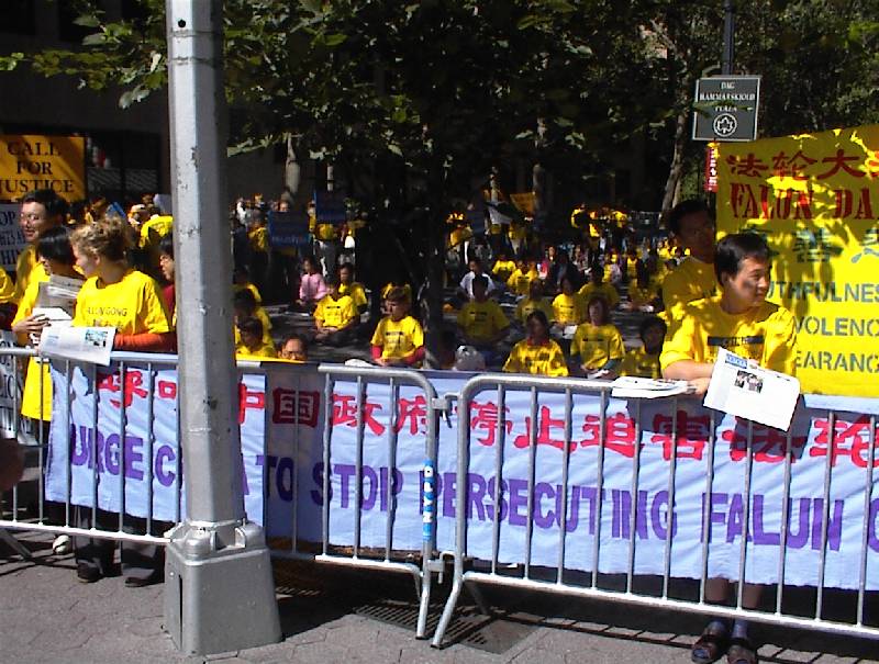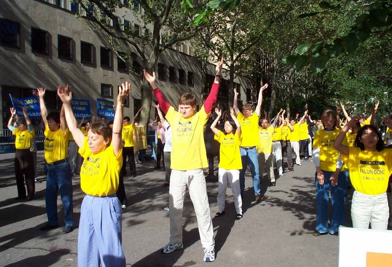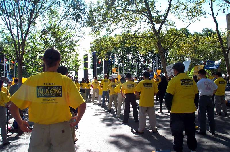 联合国前的请愿活动于九月五日上午九时开始, 地点位于纽约曼哈顿第一大道与第47街交界的哈玛绍(Dag Hammarskjold Plaza)广场。经过申请, 法轮功学员取得了二百人参加的许可。此次活动以一百多名加拿大学员为主,另有美国各州及世界各地代表学员为辅。