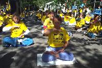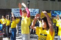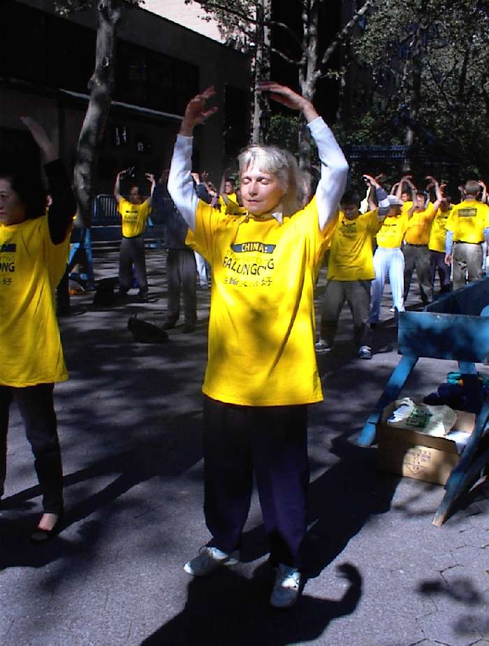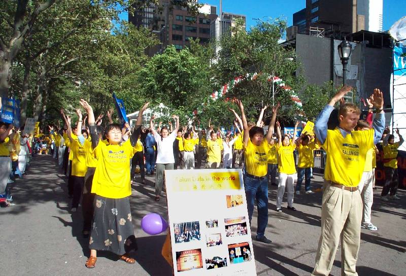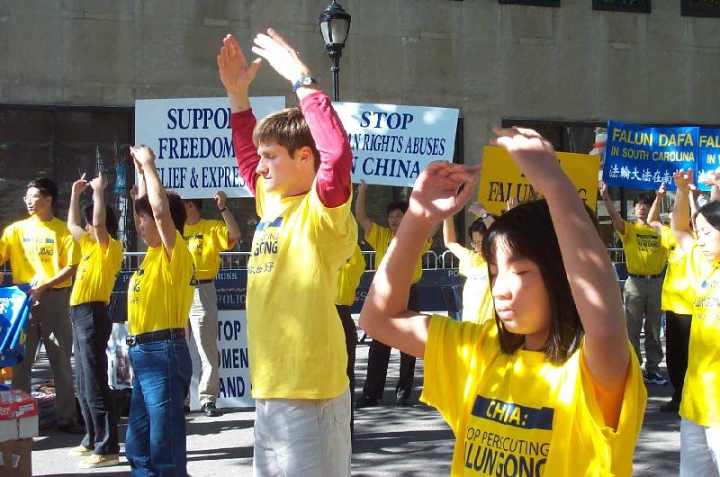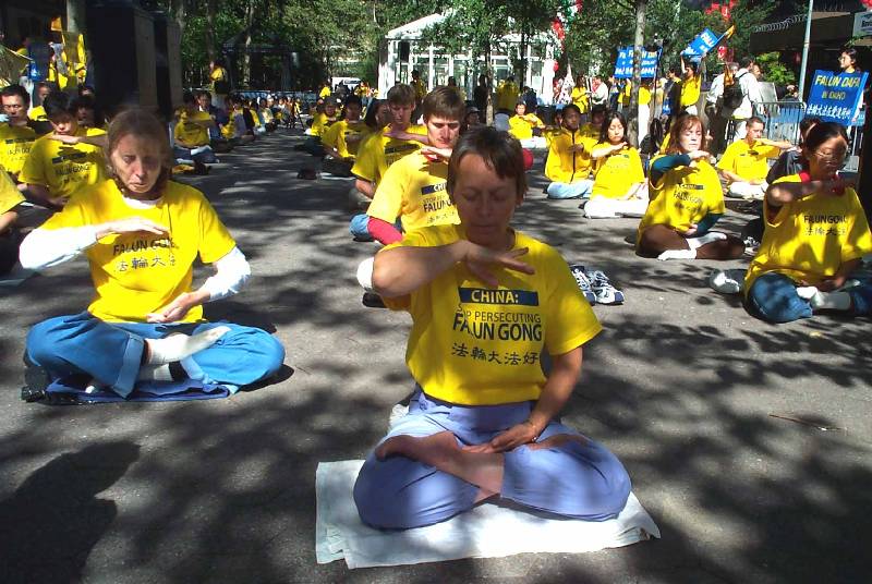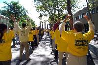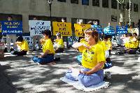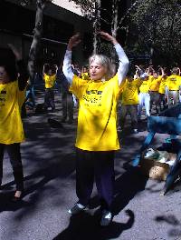 学员们随着音乐开始一遍又一遍地演炼五套功法。临街的前排学员手持“一亿法轮功修炼者为何遭迫害”,“呼吁中国政府停止迫害法轮功”等标语,希望引起世人对中国政府粗暴无理处理法轮问题的关注。