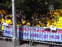 大约十一点左右, 右边的台湾人社团及左边的伊朗社团陆续集合。两边的锣鼓喧天与学员宁静的打坐状态形成了一种强烈的对比。因此原本竞相摄影两边活动的媒体,反倒对法轮功感兴趣, 到处捕捉学员打坐入静的神情。