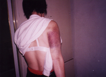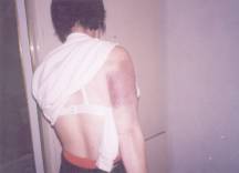 【明慧网2001年1月1日】近日,见到北京上访的两位功友,据她们讲26日早到北京天安门证实大法,在7:30点升完国旗后,当其中一位功友拉开条幅,并用力喊:“法轮大法好!法轮大法是正法!”很快就被两个警察捂住嘴并强行拖到车上,上车后用胶皮棒使劲打,一直到打累了才停下来,当时这位功友的右臂被打的不能动也没有知觉了,另一位年龄70岁的功友,头部、脸部被胶皮棒打破了,满脸都是鲜血,很多同修都被打得到处都是伤。因广场上看升旗的人很多很多,在广场上它们不打,为了掩盖它们的暴行,都在车上打。现将一些图片公布如下:
