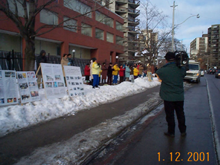 面对寒冷的天气,新闻媒体又一次对法轮功的报道表示出极大的热心,有五家电视台前来采访,他们不仅全面地报道了新闻发布的过程,而且对在冰天雪地下静静炼功的群体恋恋不舍,有一家电视台几次要求学员延长练功时间,以便把练功的场面作为新闻十分难得的背景摄入摄像机中。自从去年十月起,在每个工作日都有学员自发地到领馆门前炼功一两个小时,同时借此机会向中国政府表达释放所有被关押学员的心愿。有的学员表示:只要邪恶势力还在镇压法轮功,我们就一天不停止到领馆前和平请愿。在今天的新闻发布会上,法轮功学员表示:对法轮功的镇压是邪恶的,是江泽民利用非法获取的权势胁迫中国政府屈从于它的淫威而犯下的滔天罪行。释放一个张昆仑是远远不够的,必须无条件释放全中国所有被关押的法轮功学员,推翻全部强加在法轮功和修炼者身上的不实之词,还历史以清白。前来采访的媒体包括加拿大国家电视台CBC,世界日报,CTV,CITYTV,CFMT,680Radio,CFTO,多伦多太阳报、星岛日报等。