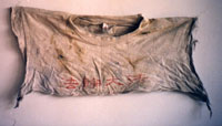 【明慧网2001年1月15日】我是11月份去北京上访,在天安门护法,最后被警察抓住。 因不说姓名被送往密云县看守所。在一间看守所里,小小房子关了我们十几个大法弟子。管教让我们分两排坐好,说是有人要来参观,要我们配合一下。我们说:我们是正法来的,不是罪犯,更不会配合你们。这时六个管教用皮带抽打我的头部,用警棍打其他同修的肩、后背,我们没有屈服。它们用手抓住我们的头发强行转过来,我们又转回去,围成一圈。它们穷凶极恶地用手撩起我们的衣服,露出肉体,用警棍打。大法弟子告诉它们说,我们是正法来的,阻止正法是有罪的,善有善报,恶有恶报。他们可能是打累了,也许是害怕有报应,停止了打骂。结果,参观的人没到我们这来。它们走后,我用水池上放着的一块抹布擦手,最后洗净这块布一看是一件汗背心的上半部分,前面印有“法轮大法”字样,后背是“真善忍”三个大字,衣服被撕破,上边血迹斑斑清清楚楚(见照片)。原来这是关押在此的大法弟子们穿过的,我把他悄悄带出来,将他作为邪恶迫害大法弟子的见证,让世人知道真相。