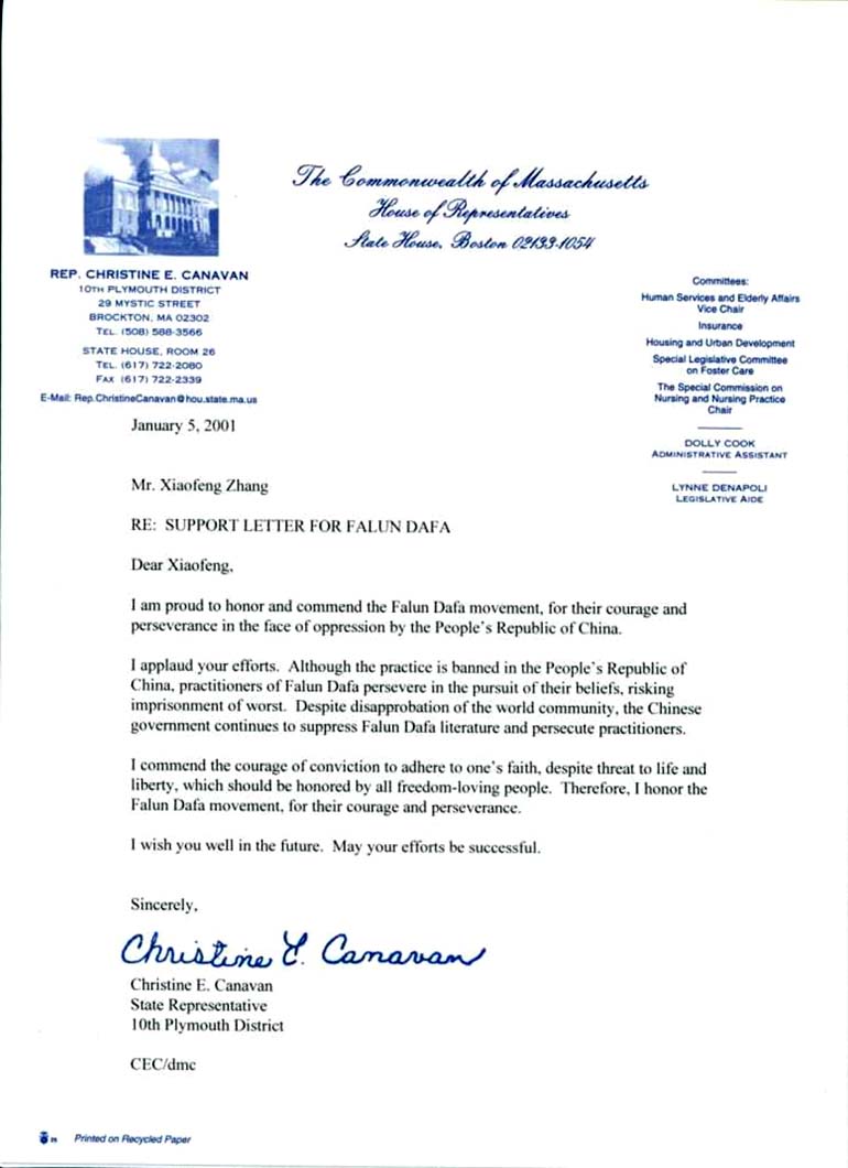 麻州议员(Christine E. Canavan)支持法轮大法的一封信