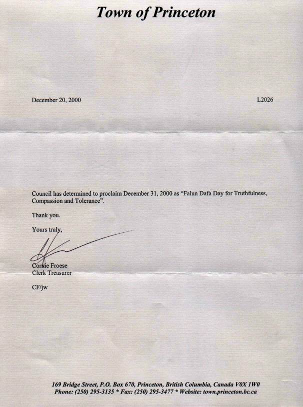 【明慧网2001年1月17日】 不列颠哥伦比亚省普林斯顿镇宣布2000年12月31日为“法轮大法真善忍日”